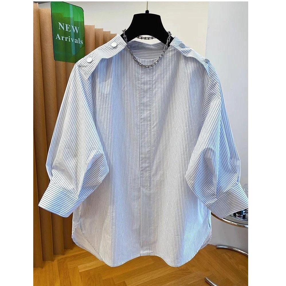 【爆款热卖】2026夏季新款宽松百搭蓝色条纹圆领衬衫五分袖衬衫 蓝色条纹 M 【建议110-130斤】