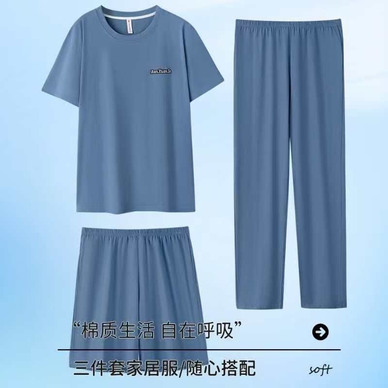 100纯棉睡衣男士夏季短袖长裤短裤三件套夏天薄款休闲家居服套装