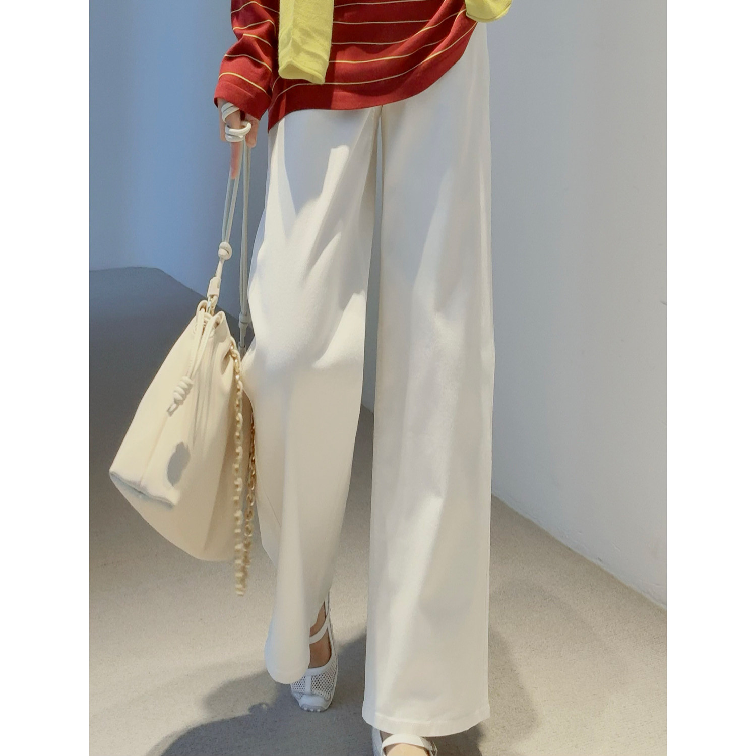 Basic House/百家好条纹假两件针织衫女v领抽绳温柔风长袖上衣春