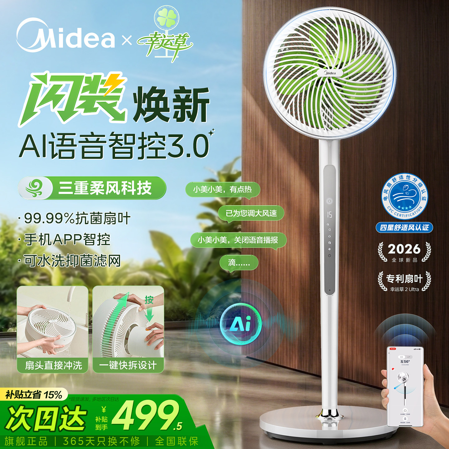美的空气循环扇幸运草家用电风扇卧室大风力音静语音26新款2Ultra