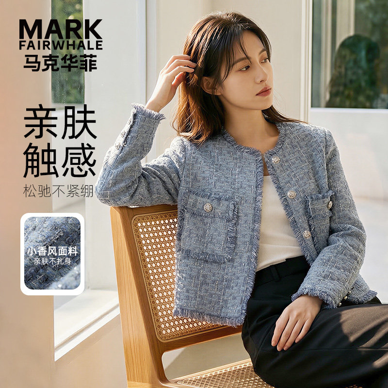 马克华菲气质重工2026春新款小香风粗花呢正肩圆领纽扣长袖外套女