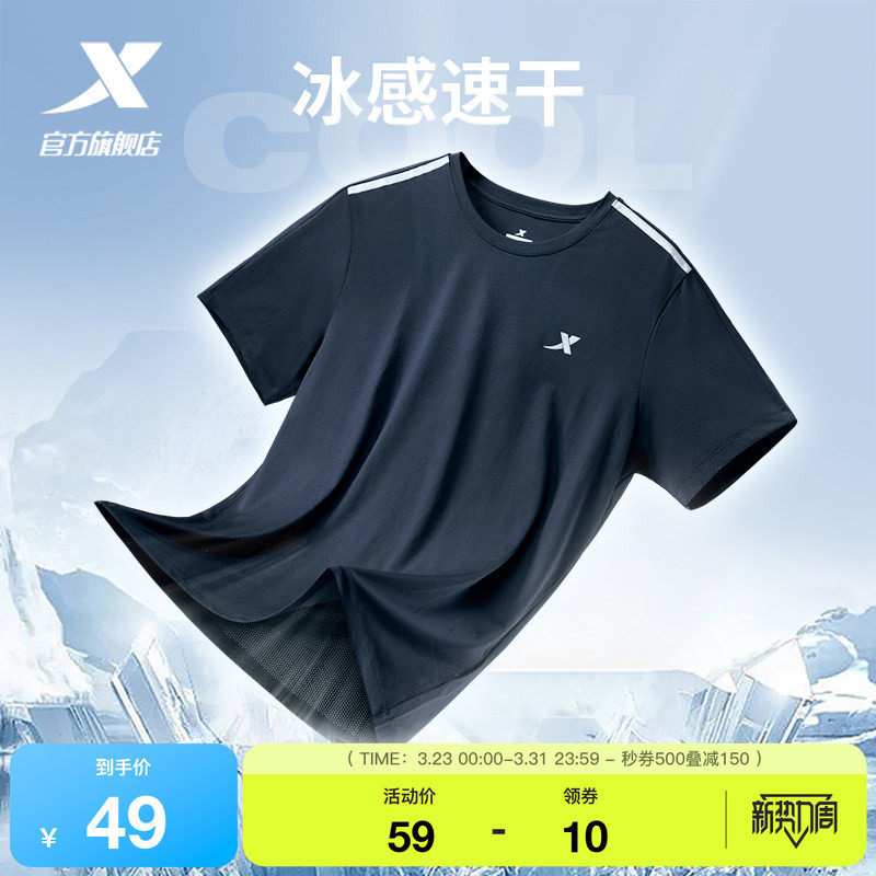 特步速干T男夏季宽松短袖冰丝户外跑步T恤透气上衣男士健身运动服